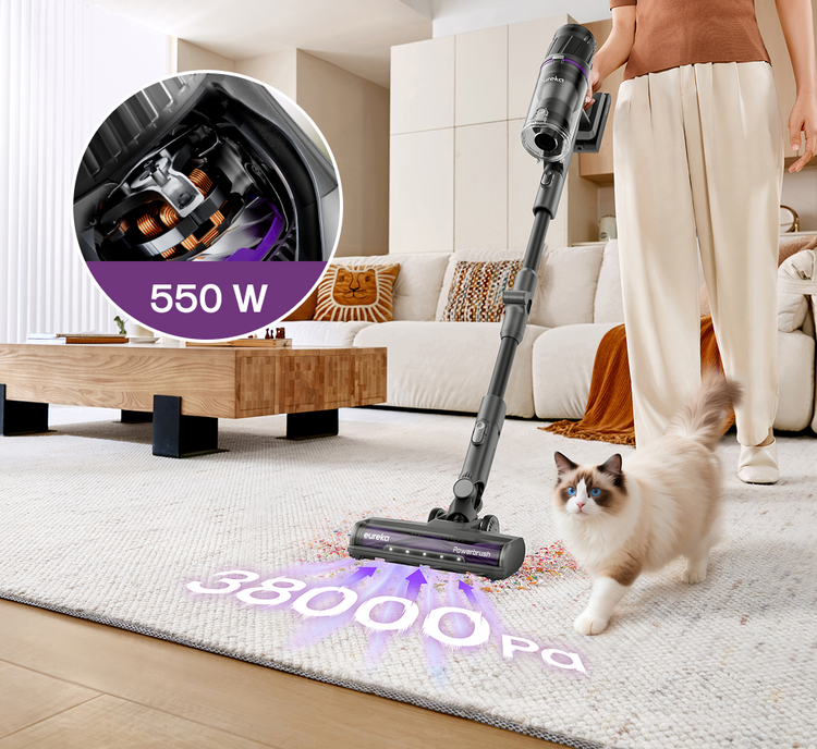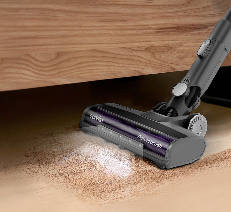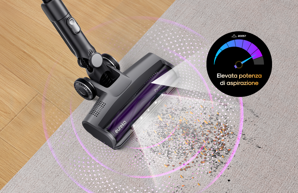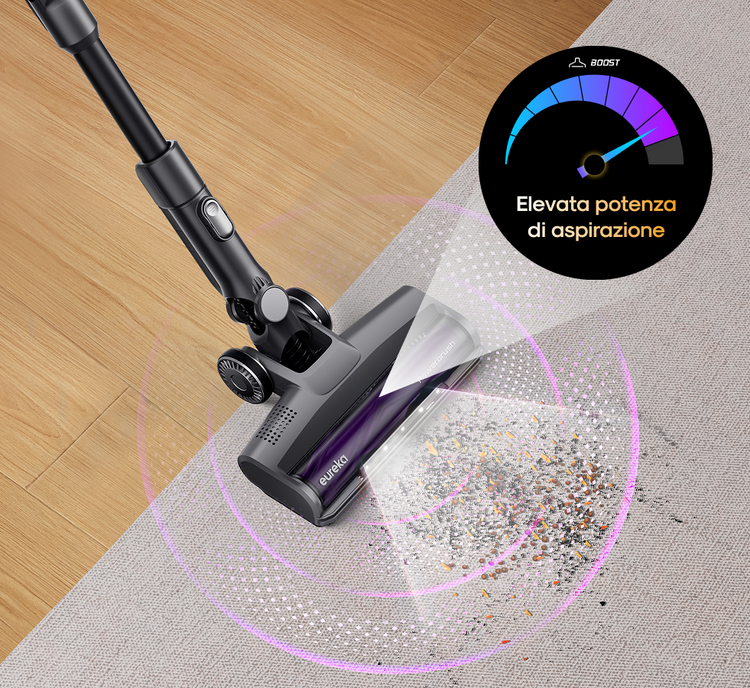 L'esclusivo rullo spazzola di Eureka con illuminazione ultra luminosa estende la tua portata di pulizia e rende visibile anche la polvere più fine - nessuna briciola ti sfugge.