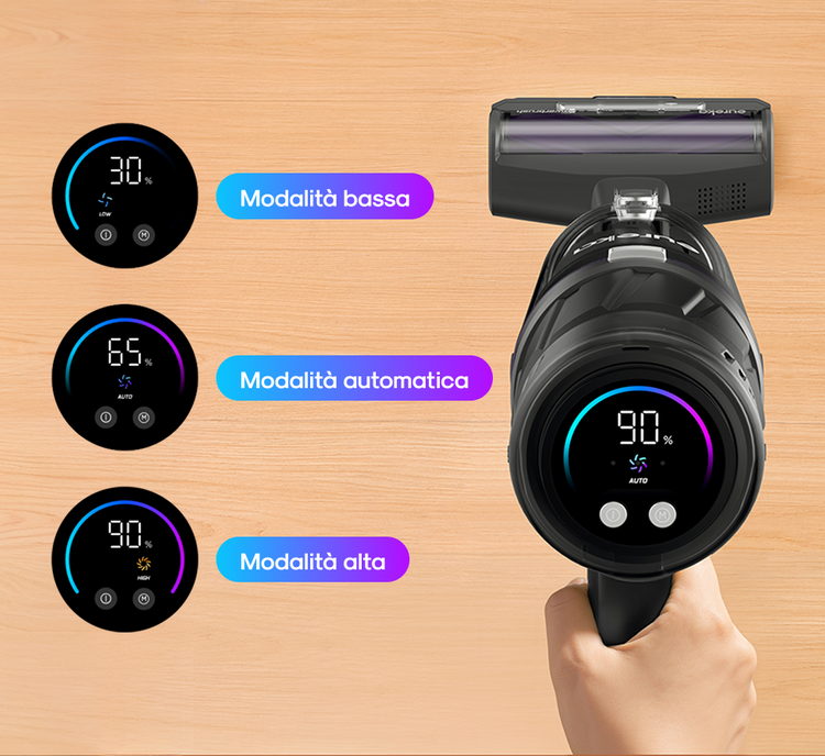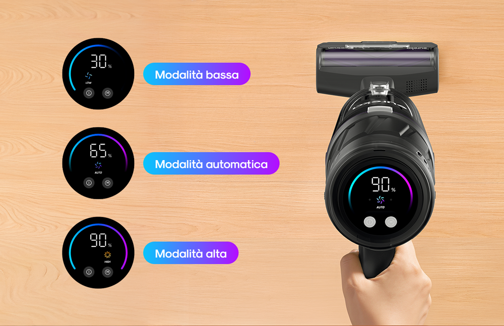 Il display a LED mostra lo stato a colpo d'occhio: livello della batteria, modalità di pulizia e stato di funzionamento.